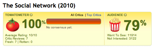 The Social Network debuts at 100%, with critical comparisons to Citizen Kane and The Godfather.
