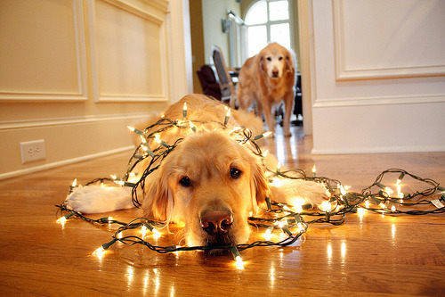 Retrievers lounging with lights.