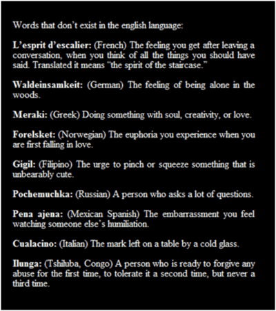 September 21, 2011 by Kanyi Leave a comment Essays Words that don’t exist in the English language… My language has plenty of these as well. Related